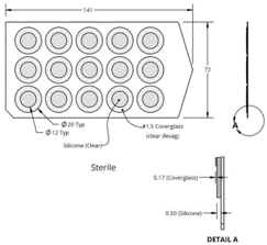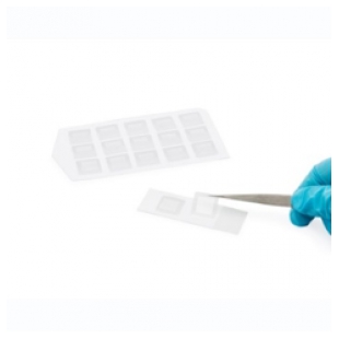 產(chǎn)品由上下兩部分構(gòu)成:上層是No.1.5厚度的玻璃蓋玻片,下層是0.5mm厚度的透明硅膠片,無菌包裝可直接使用。設(shè)計上硅膠片較玻璃片略大,比如蓋玻片12*12mm大小,下方的硅膠片17*17mm大小,產(chǎn)品大小特別適于培養(yǎng)皿和培養(yǎng)板使用。包裝時,背襯底板是透明大塑料板,一板15個,一包有5板(共計75個)。