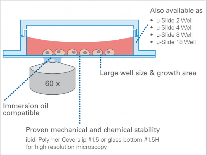 µ-Slide 1 Well Uncoated: #1.5 polymer coverslip, hydrophobic, sterilized |