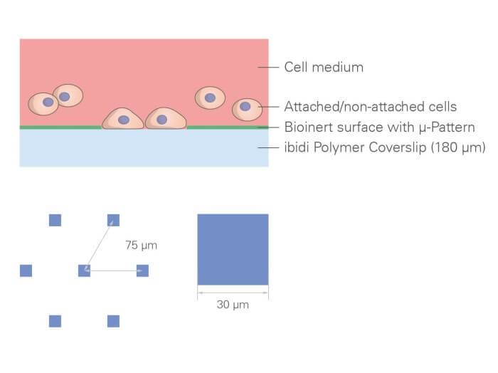 ibidi 的 µ-Patterns 可用于從細胞懸液中創建精準的單細胞陣列,使細胞能夠在限定區域內直接粘附并生長于圖案表面。